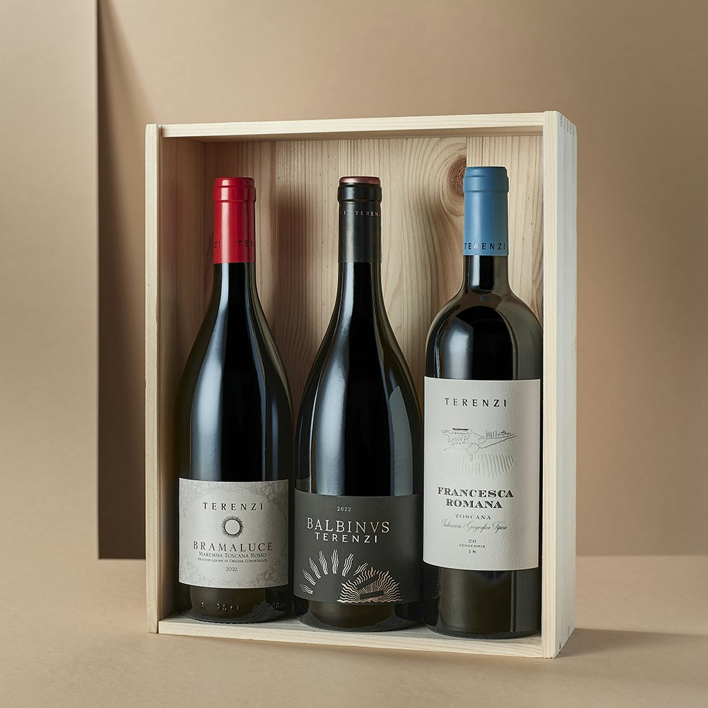 Un mix unico per chi apprezza tradizione e sperimentazione, questa confezione trasmette tutta l’eleganza che la Maremma può regalare, unendo territorio e internazionalità con un blend innovativo di Sangiovese e Syrah, un Vermentino minerale e complesso e il taglio bordolese firmato Terenzi.